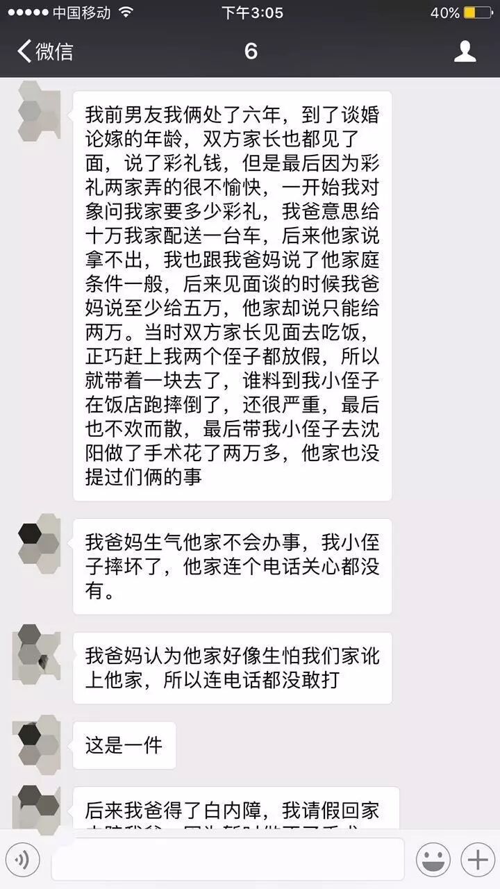 我前男友和我处了六年,到了谈婚论嫁的年龄,双方家长也都见了面,说了彩礼钱,但是最后因为彩礼两家弄的很不愉快。