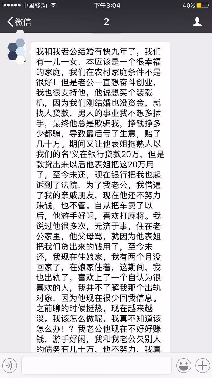 铂爱导师,我和老公结婚快九年了,我们有一儿一女,老公一直想创业,我也很支持他,他说想买个装载机,就找人贷款,后来他总是欺骗我,最后赔了几十万。