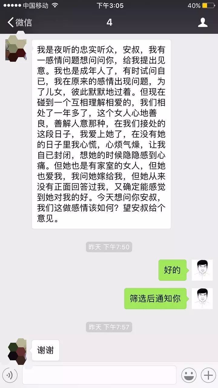 我是夜听的忠实听众,铂爱导师,我有一感情问题想问问你。我也是成年人了,有时试问自己,我在原来的感情出现问题,为了儿女,彼此默默地过着。