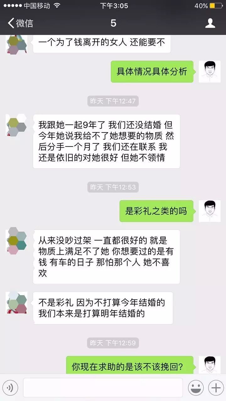 铂爱导师,我跟她在一起9年了,我们还没结婚 但今年她说我给不了她想要的物质。然后分手一个月了,我们还在联系,我还是依旧的对她很好,但她不领情。